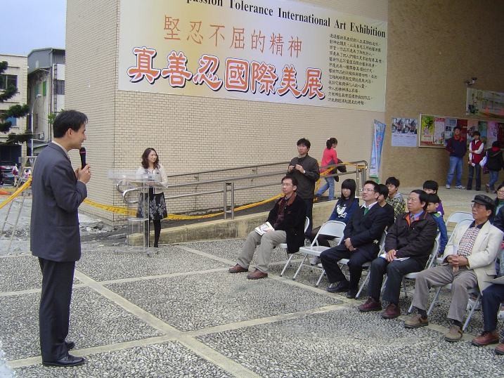 "真善忍国际美展"在宜兰文化局展出,图为来宾致词