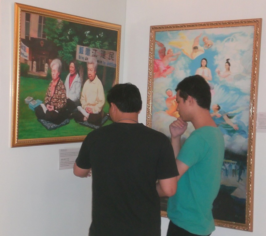 法轮功学员向前来参观的大学生介绍美展作品