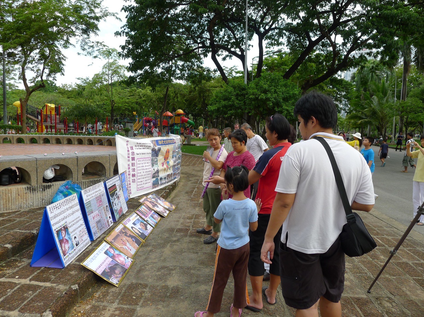 法轮功学员在"七二零"前夕曼谷是乐园集会图为民众观看真相展板