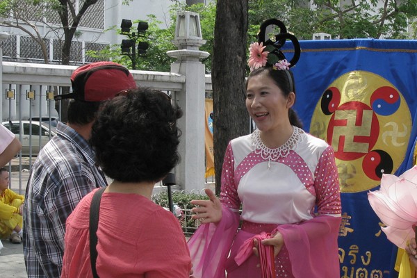 法轮功学员参加庆祝泰王84岁生日,学员向游客介绍法轮功