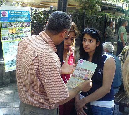 法轮功学员在土耳其安卡拉市举办征签活动图为民众(右)借大法书学习法轮功2007-7-7-至8