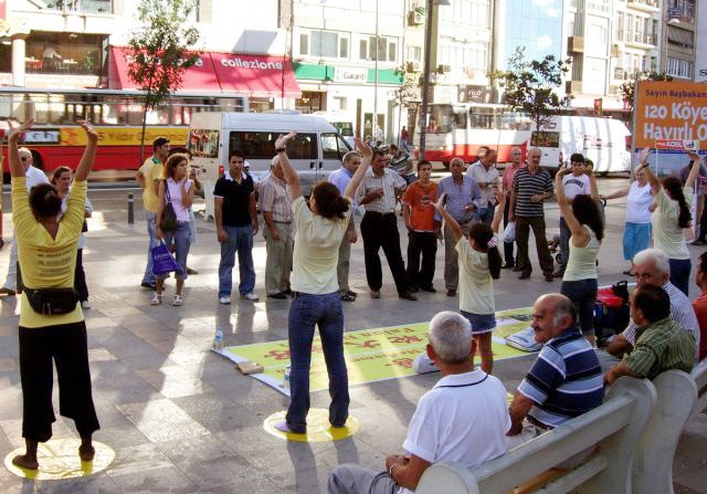 土耳其法轮功学员在Aydin的Selcuk市洪法并揭露中共的暴行图为许多民众学炼功法2007-8-20至25