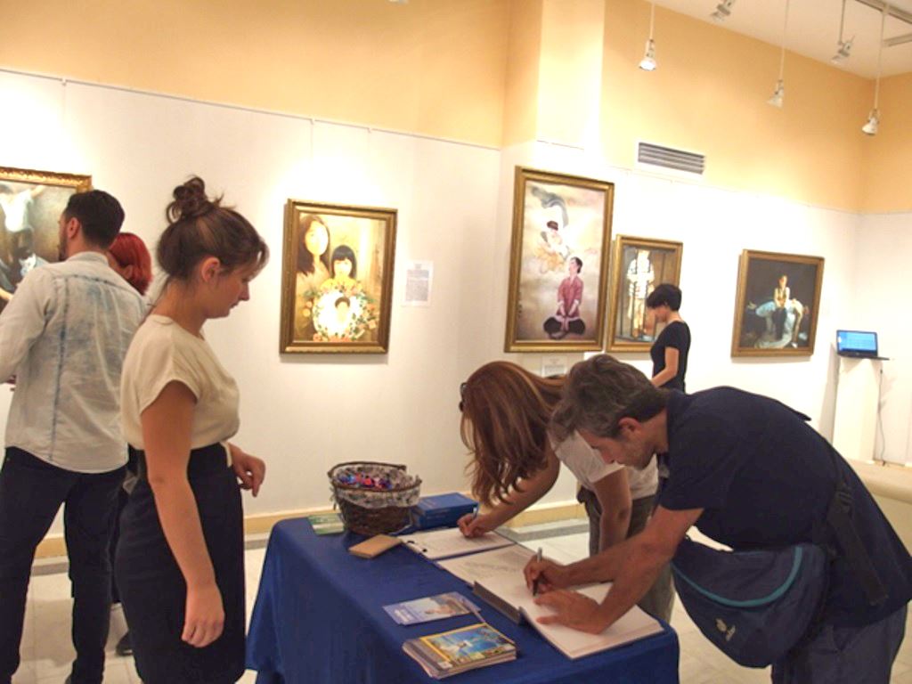 "真善忍国际美展"在Kadikoy展出,参观者在留言簿上留言