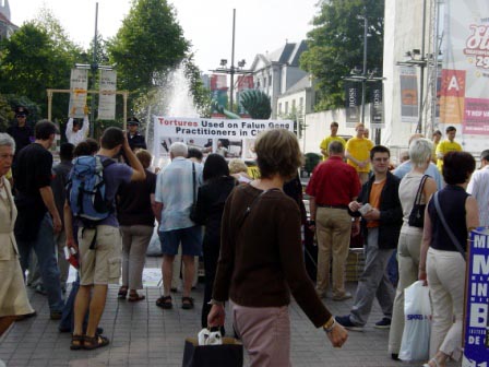 法轮功学员在比利时布鲁塞尔市中心曝光中共恶行图为人们了解中共残酷迫害的真相2008-6-7