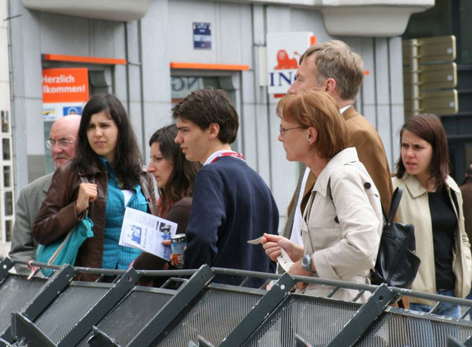 比利时学员在布鲁塞尔欧盟高峰会议期间以真人模拟的方式揭露中共对法轮功的残酷迫害 图为被真相震惊的人们2006-6-15