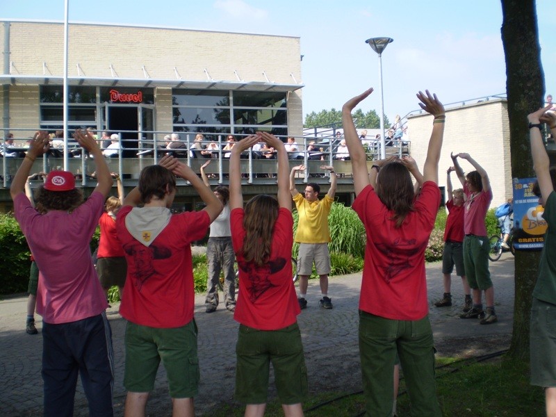 比利时学员参加在安特卫普省博姆市举行的"快乐的节日"活动,与民众同庆法轮大法日,图为演示功法 2008-5