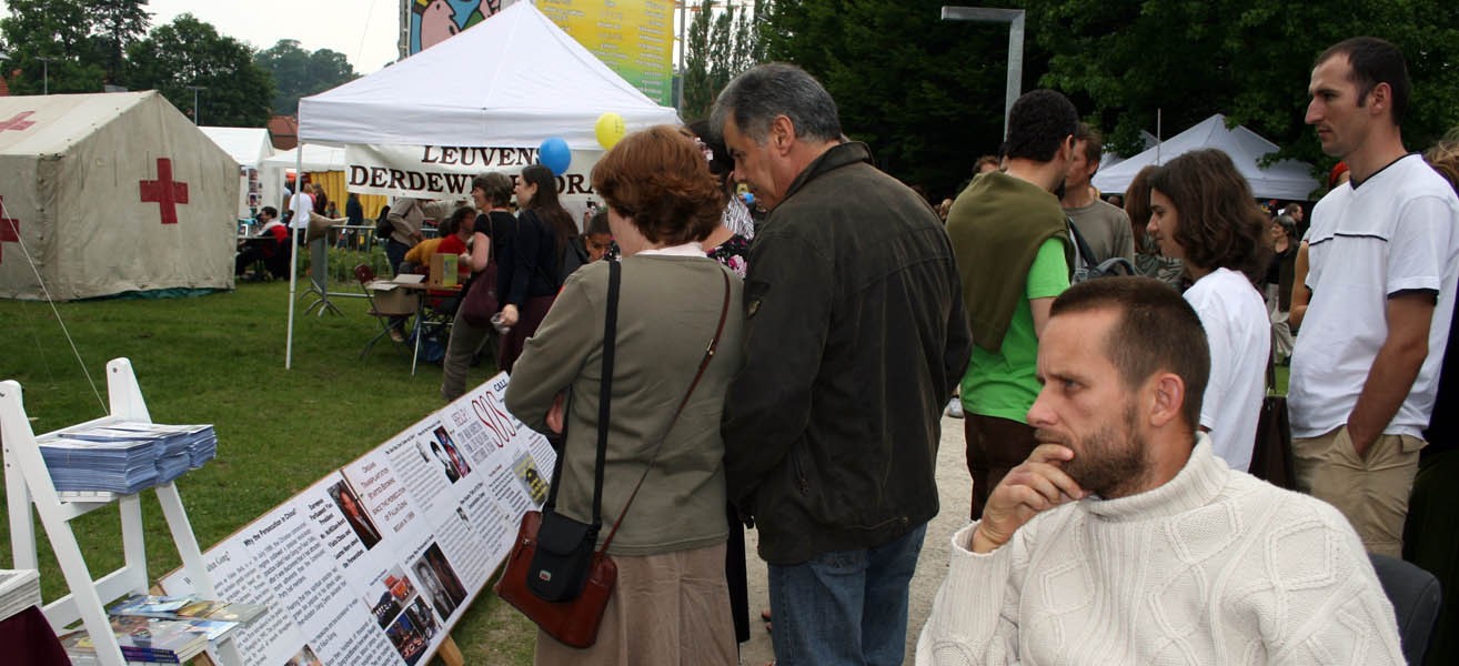 法轮功学员参加比利时Eeklo市腾栋学校校庆图为人们倾听学员讲真相及索取资料2007-5-5