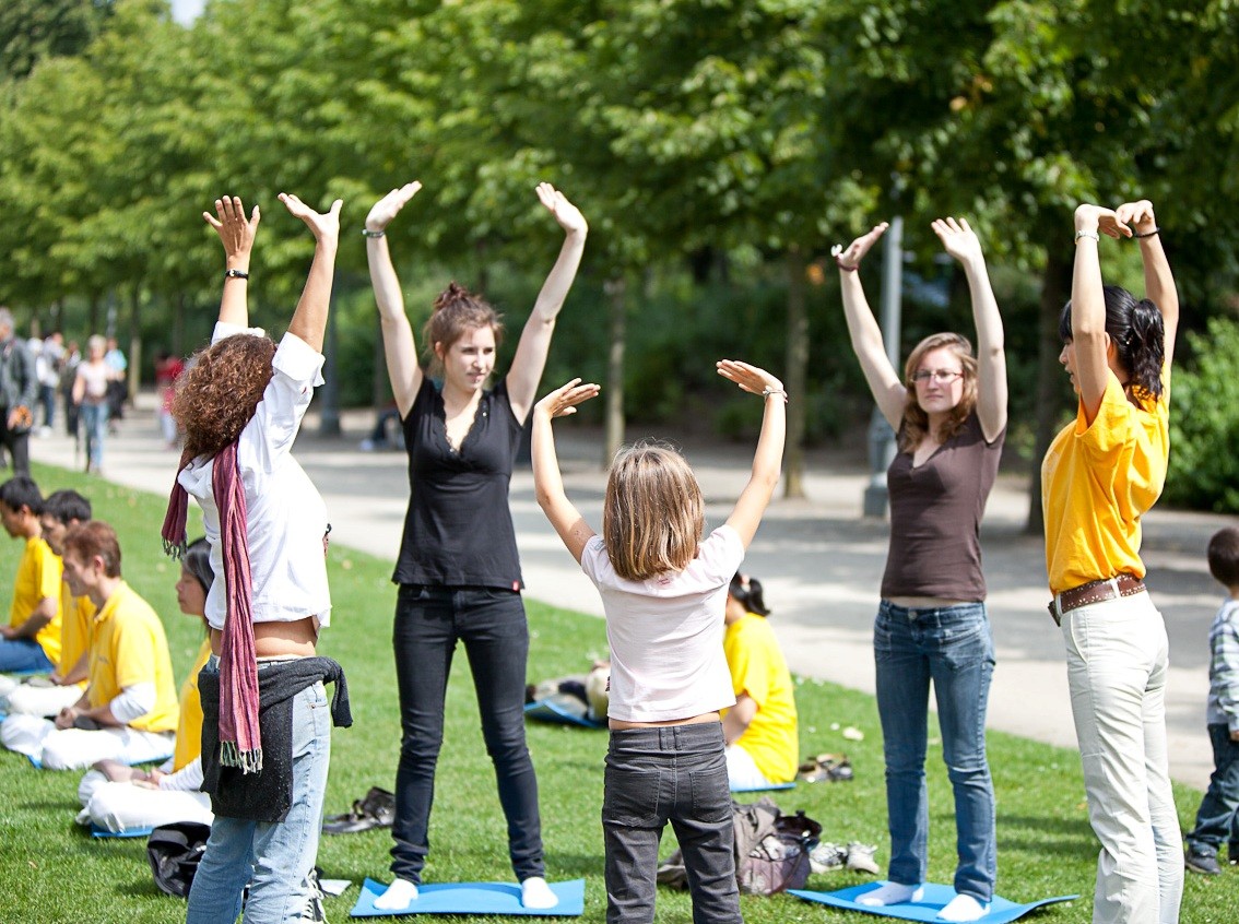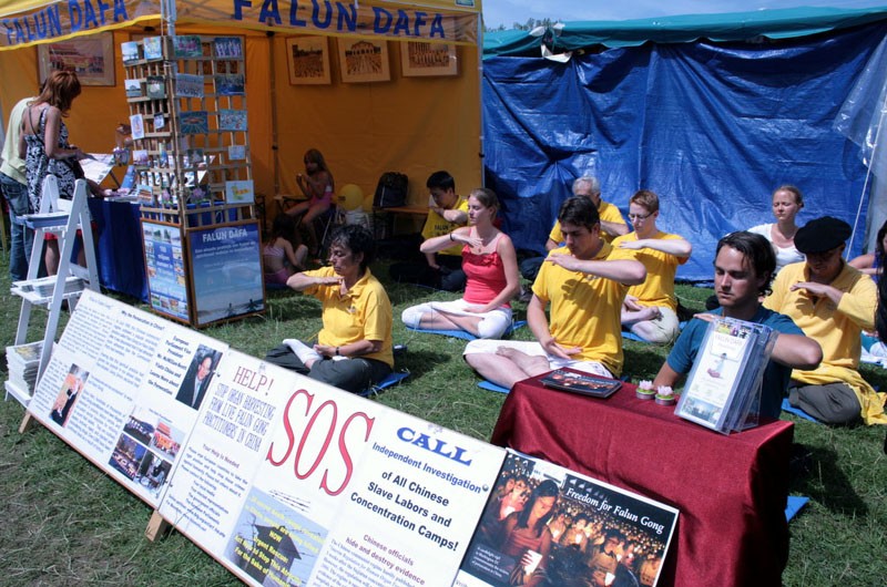 梅赫伦市民卢卡斯(右二)在夏日节庆上学炼法轮功