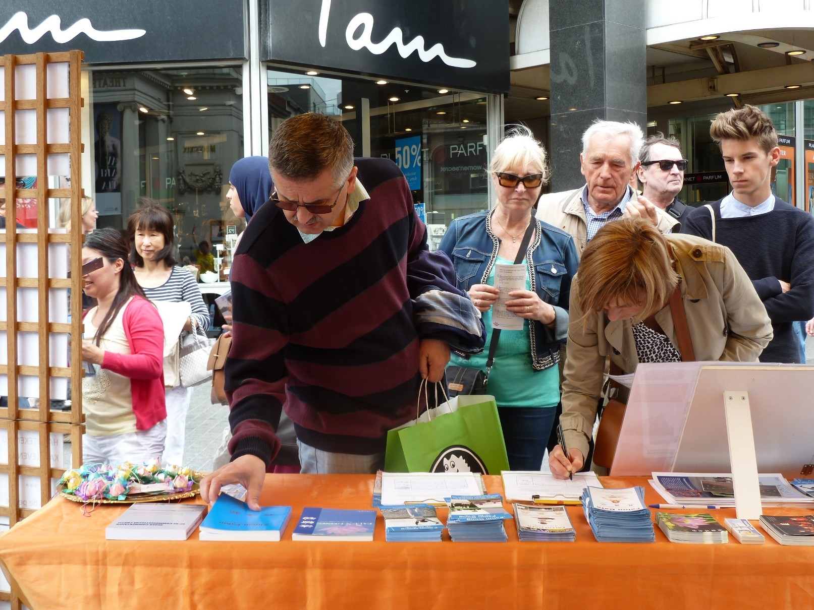 大法学员参加比利时国庆日庆祝活动图为展台前的人们