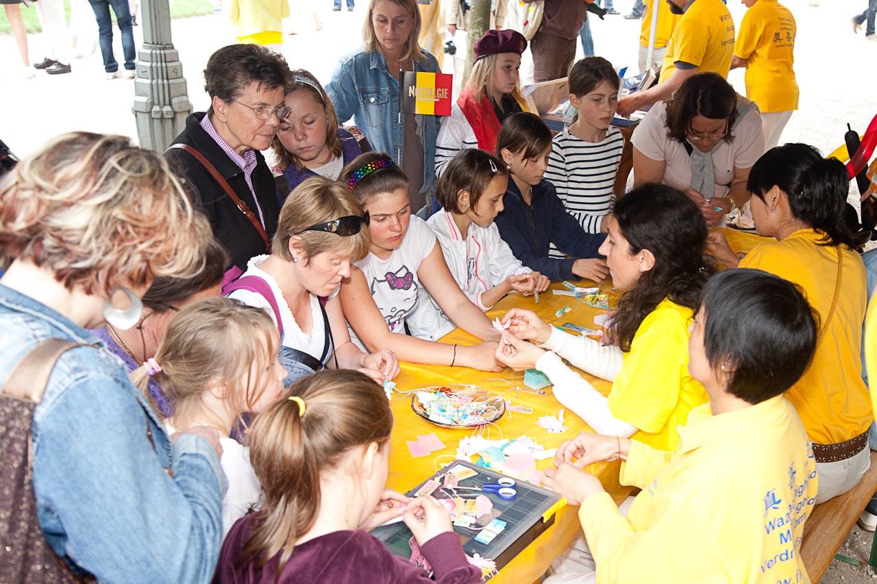大法学员参加比利时国庆日庆祝活动图为学做纸莲花