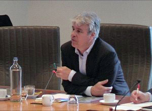法轮功学员应邀出席比利时弗拉芒议会在布鲁塞尔的议会大楼举行的中国人权与奥运听证会,图为弗拉芒文化与体育部长博特安西奥克斯 2008-4-15