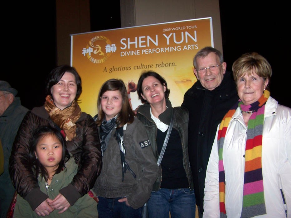 祝为华女士(右2)和朋友观赏神韵晚会在比利时的演出表示如此的节目非常非常的珍贵