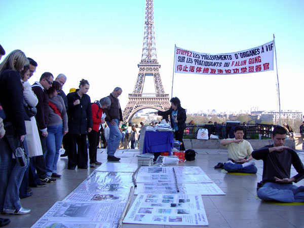 法轮功学员在巴黎人权广场揭露中共活摘器官罪行吸引来自世界各地的游客们