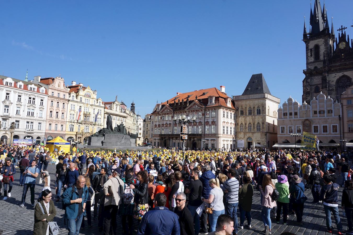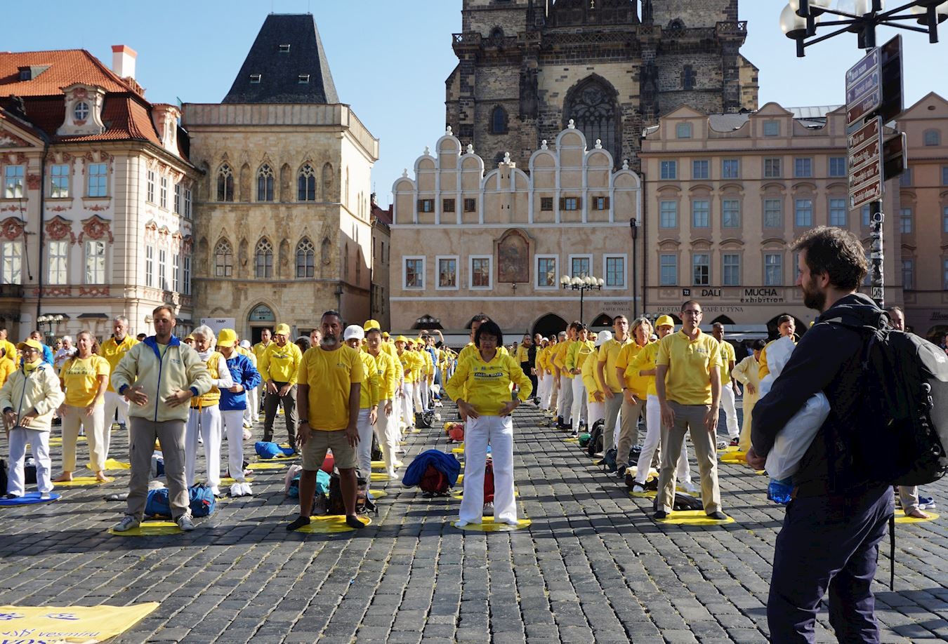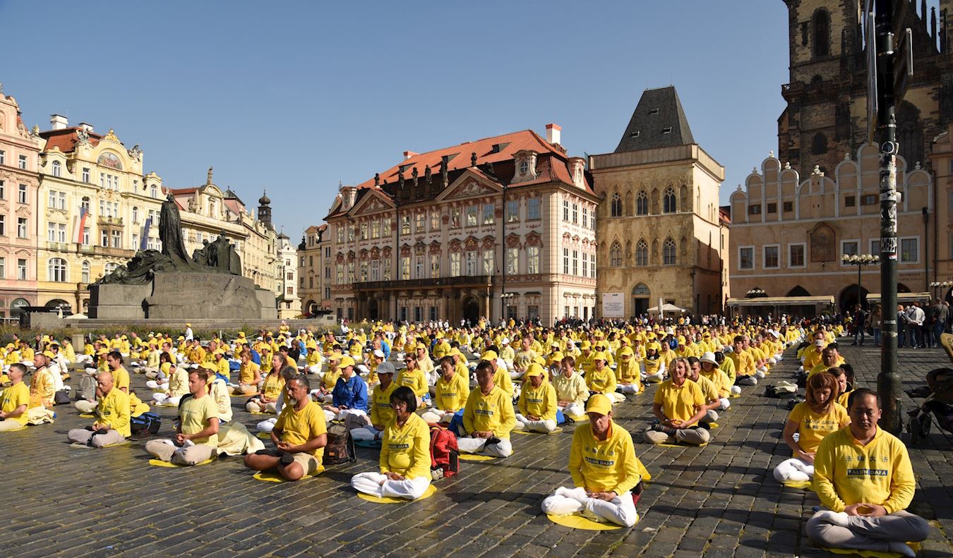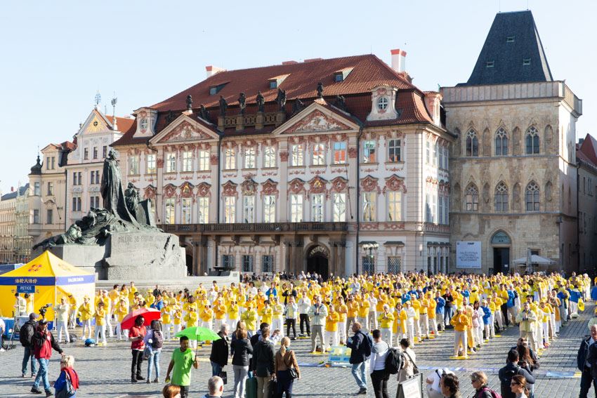 法轮功学员在捷克布拉格老城广场,举行集体炼功,讲真相
