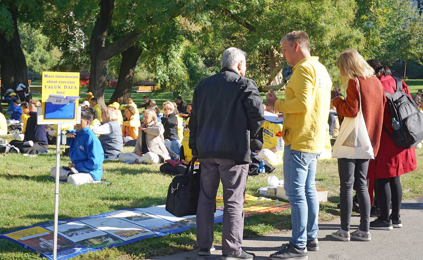 法轮功学员介绍功法,征签,真相展板举行不同活动,庆祝世界法轮大法日