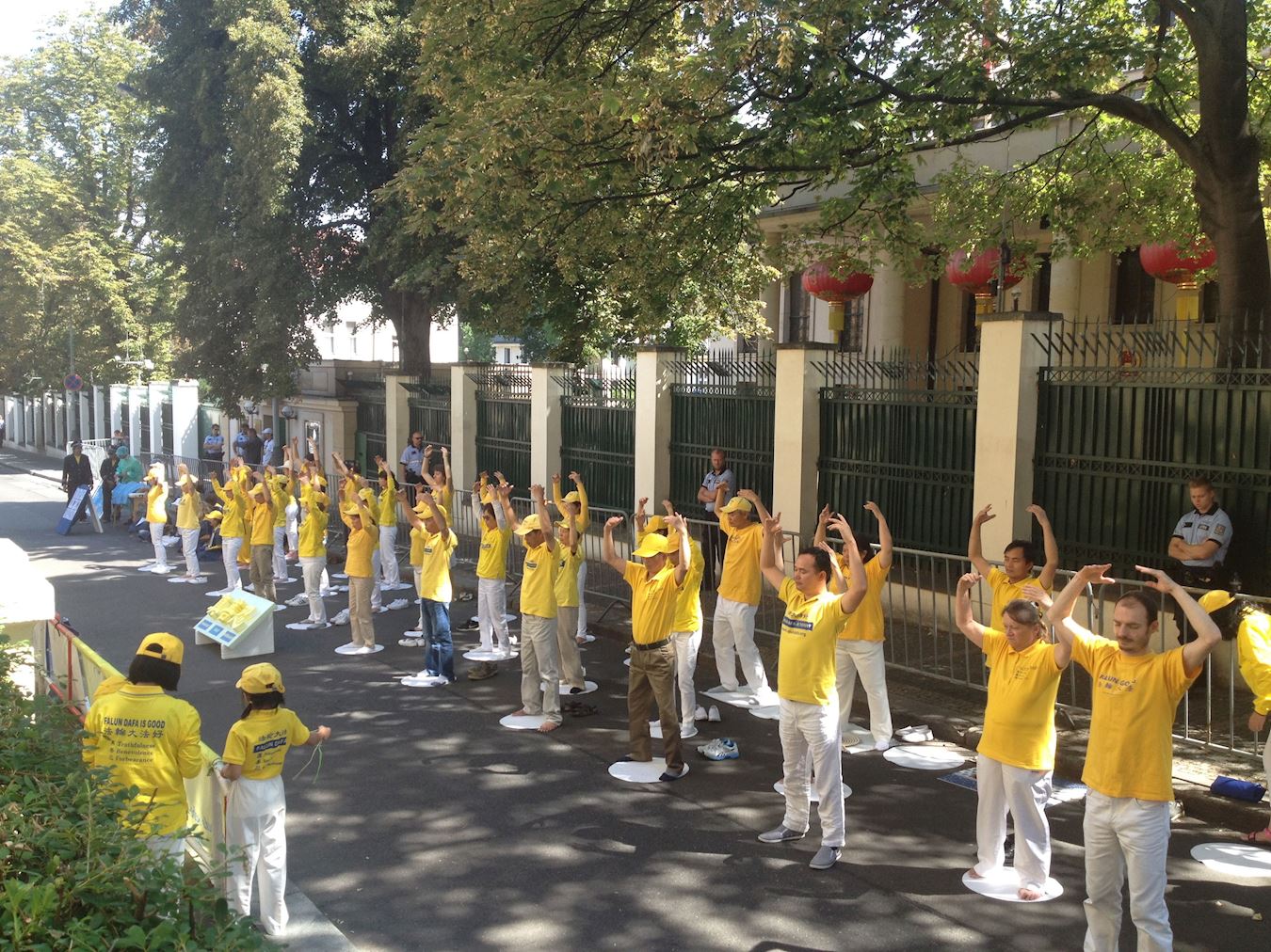 捷克法轮功学员中领馆前和平请愿 呼吁停止迫害法轮功 图为学员在领馆前发正念 2006-7-20