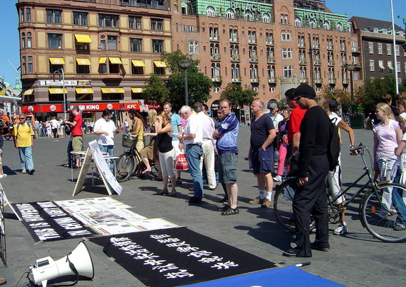 丹麦学员在哥本哈根市政厅广场揭露中共活摘法轮功学员器官的暴行 图为在了解真相的人们2006-7