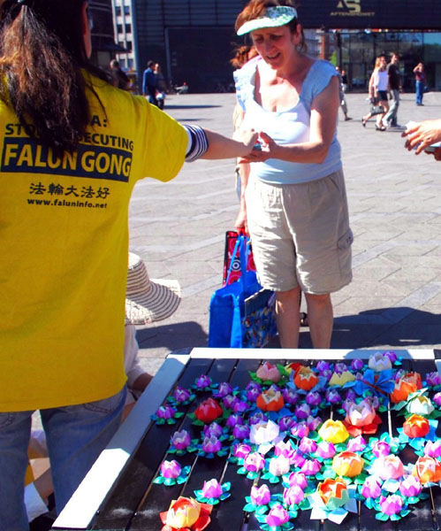 丹麦学员在首都市中心举办活动,庆祝第九届世界法轮大法日,图为赠送纸折莲花 2008-5