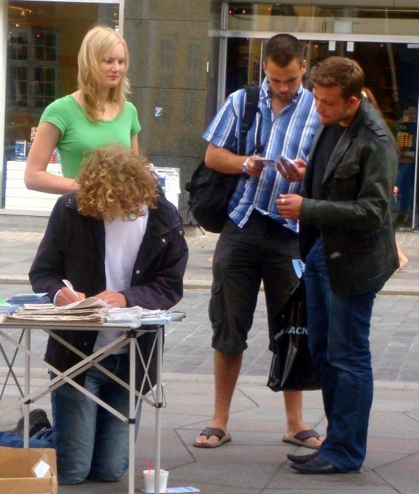法轮功学员在丹麦哥本哈根步行街洪法讲真相图为民众在反迫害征签簿上签名2007-9-9