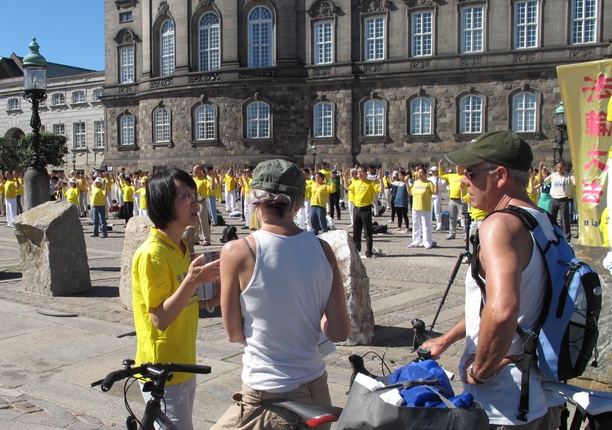 欧洲学员在哥本哈根国会广场集体炼功,讲真相