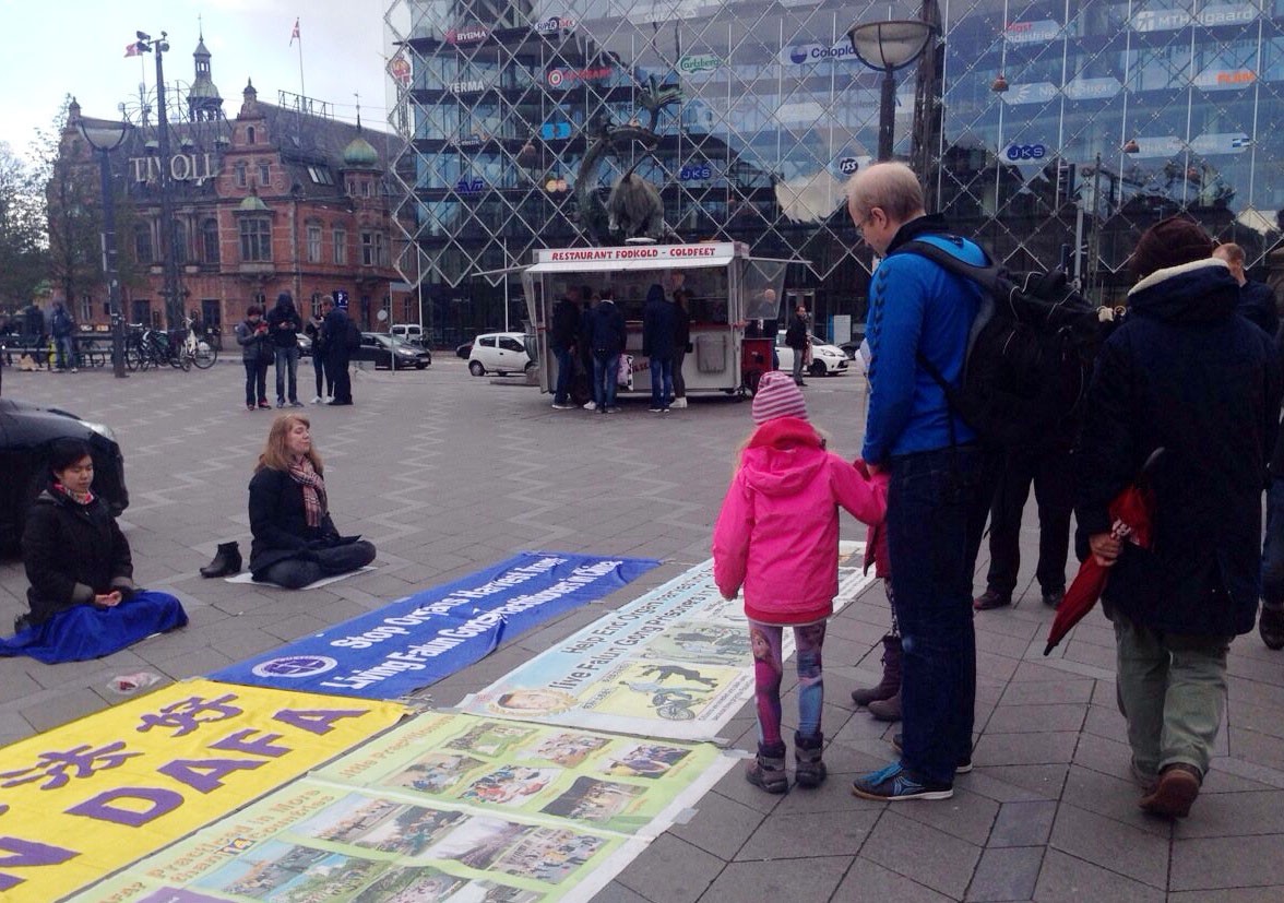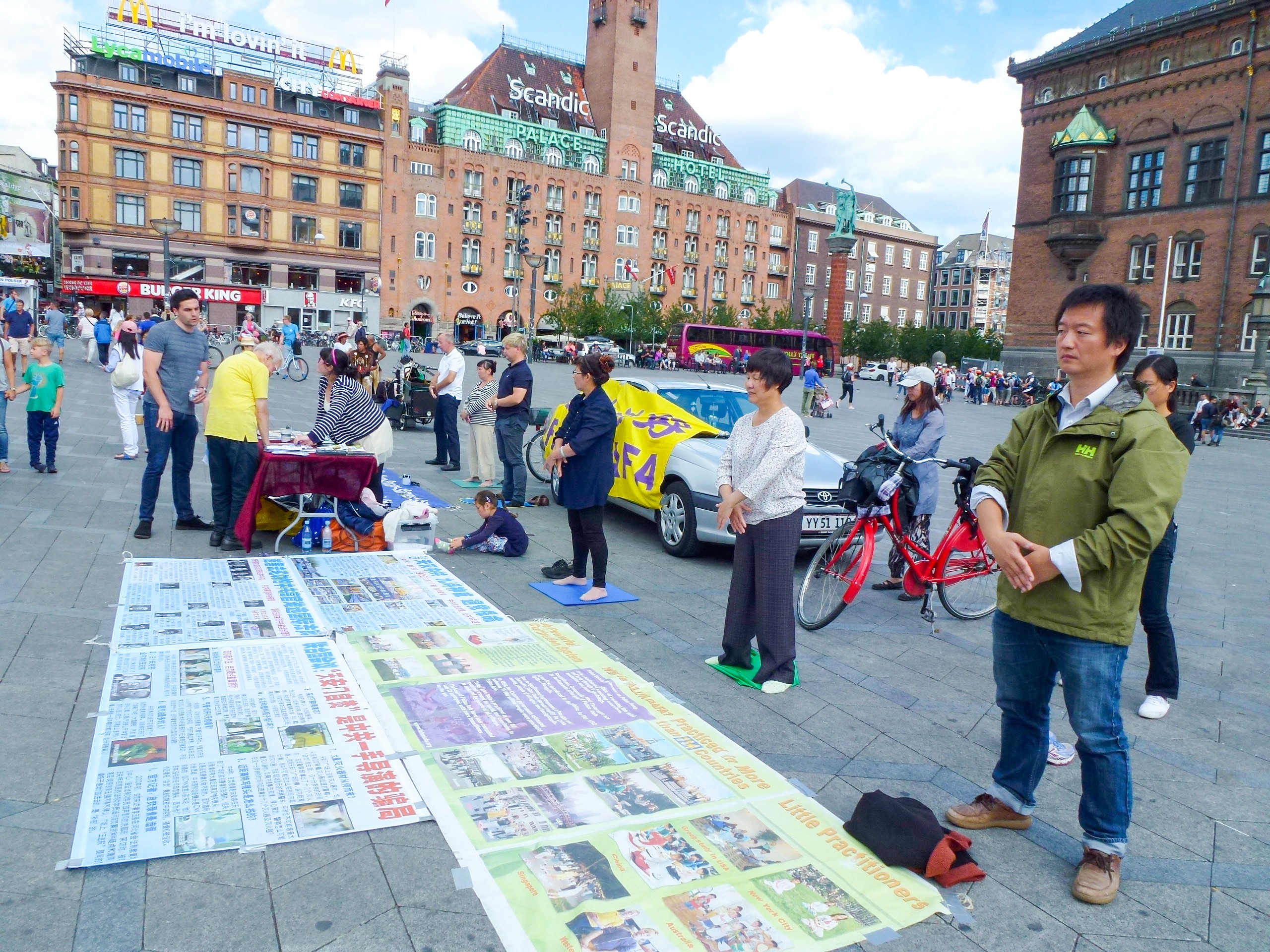 法轮功学员在哥本哈根Axeltorv广场举办活动,揭露中共长达十年的残酷迫害
