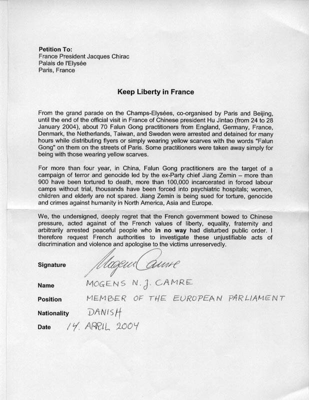 欧洲议会丹麦议员尤拉.山百克致信表示支持法轮功学员