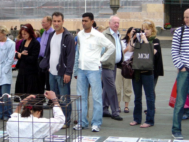 "7.20" 前夕哥本哈根反酷刑展震惊世人 图为了解真相的人群