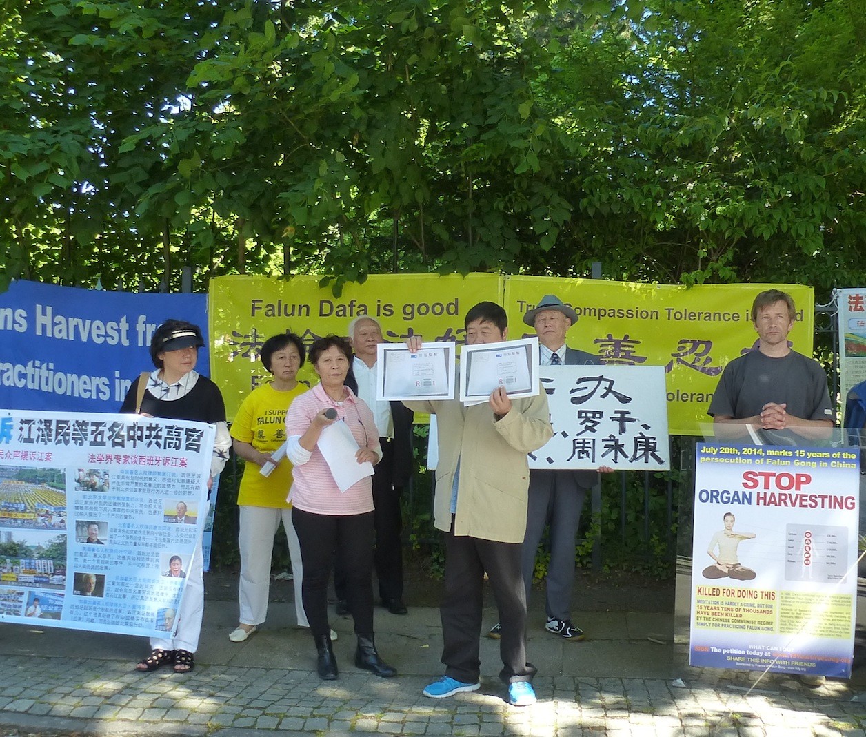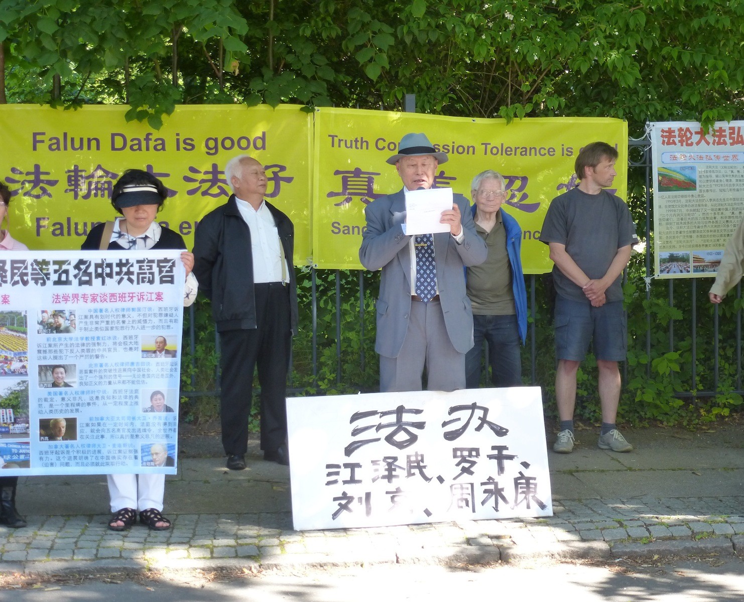 丹麦部分法轮功学员和一些正义的中国民主运动人士,来到中使馆前,声援诉江大潮