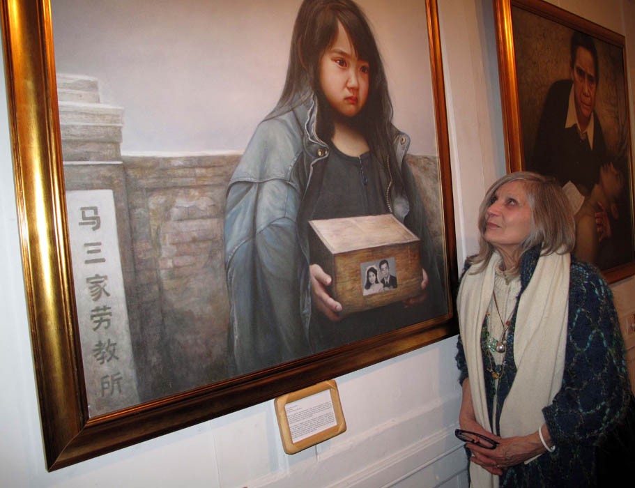 "真善忍国际画展"在伦敦Burgh House历史博物馆展出,装饰设计家Jane Standing站在最令她感动的作品前