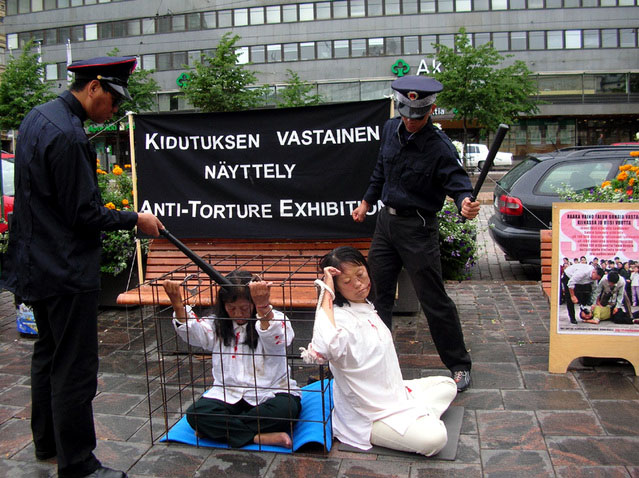 法轮功学员在芬兰首都赫尔辛基最繁华的商业街中心向人们介绍法轮功并揭露在中国法轮功学员遭受迫害的事实 图为反酷刑展