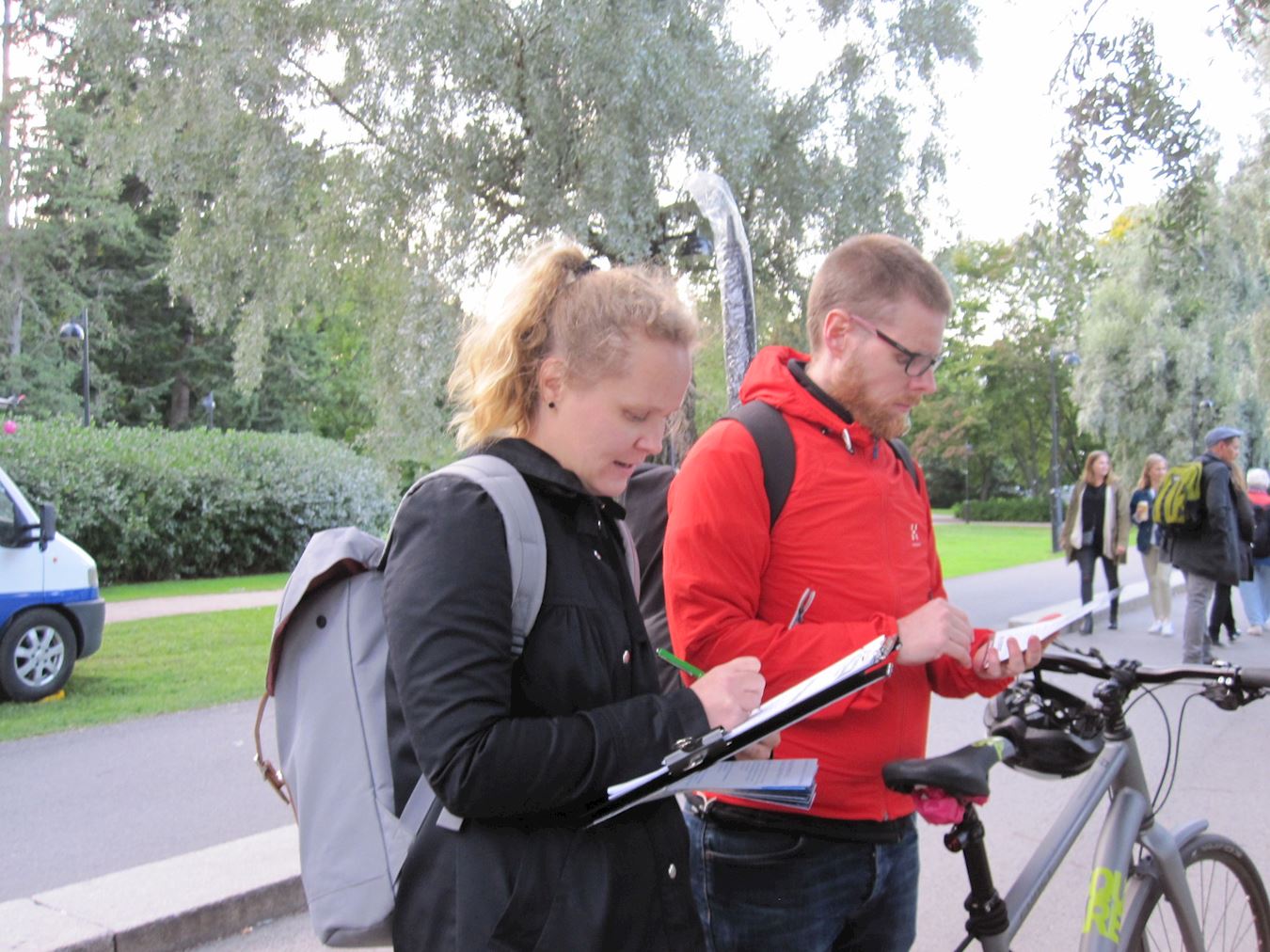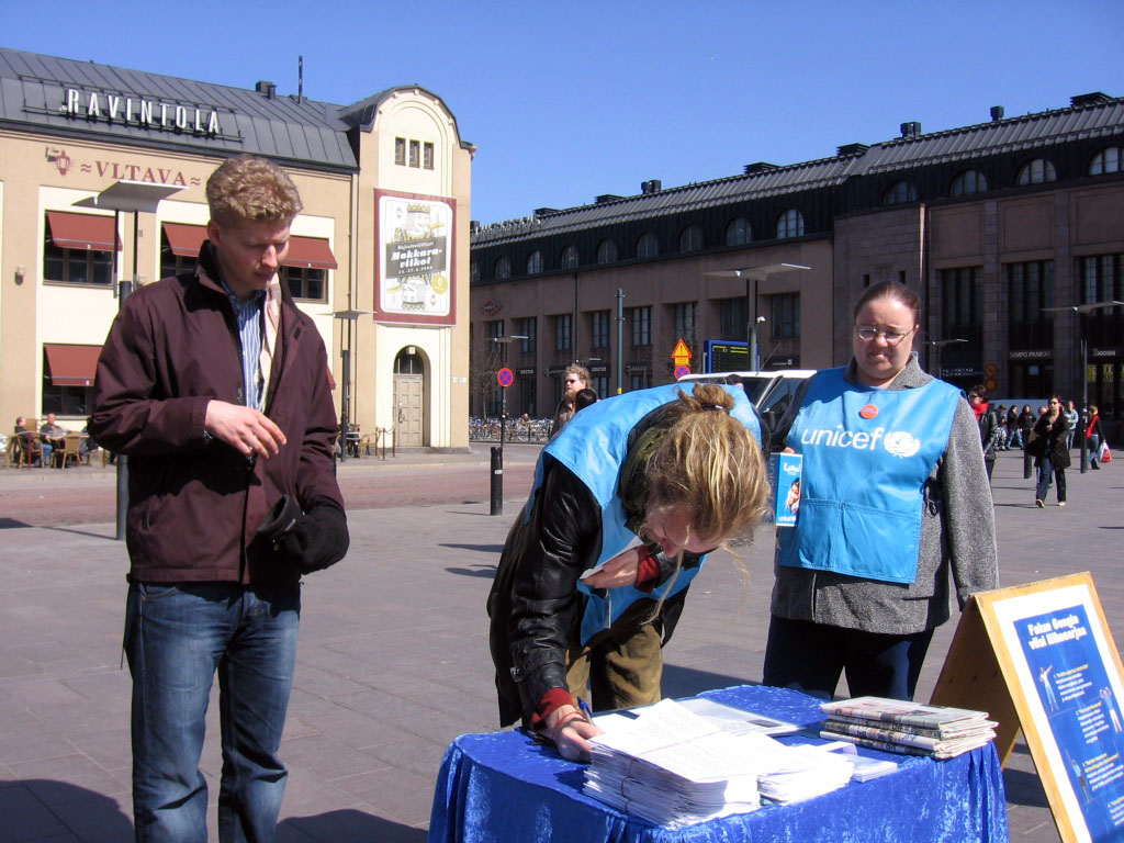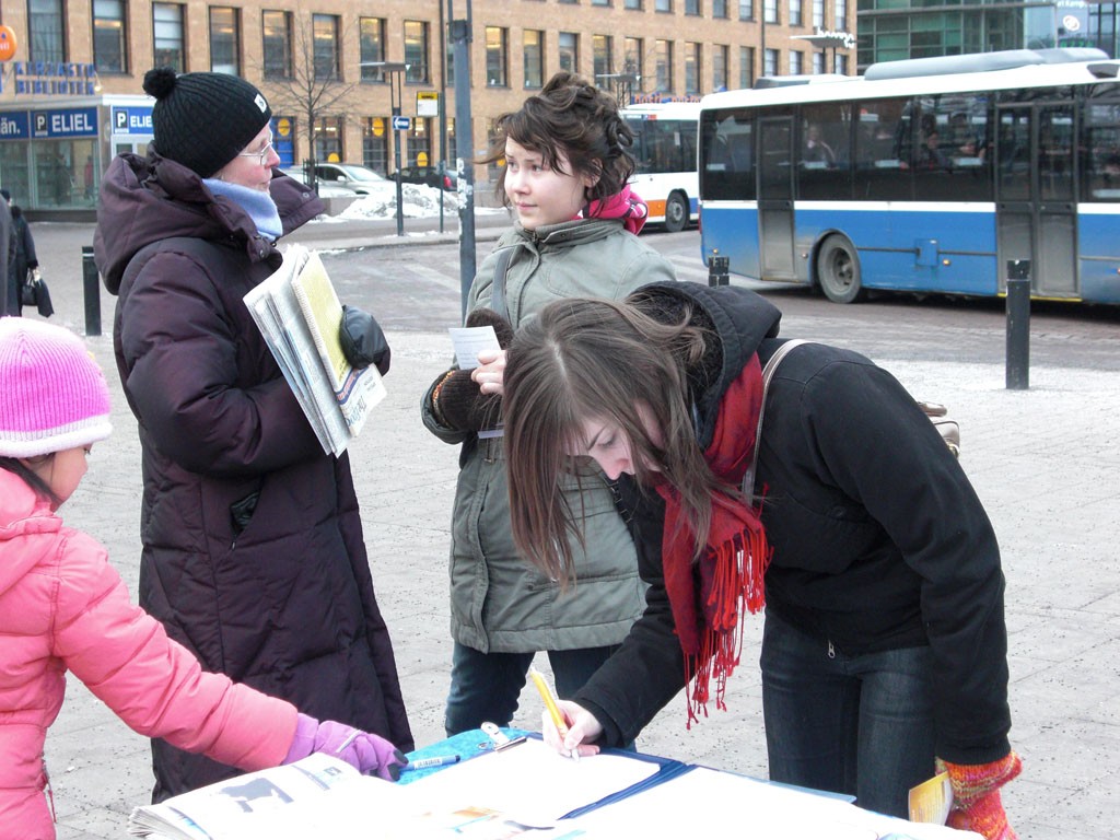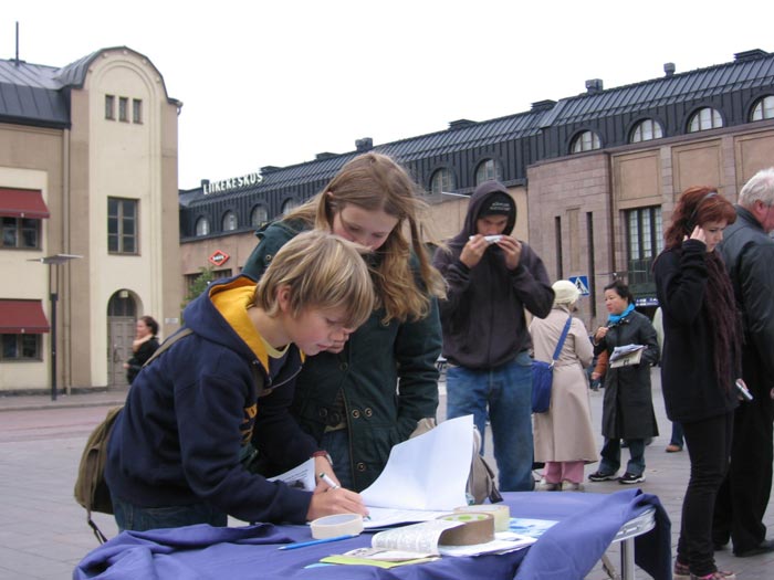 法轮功学员在赫尔辛基火车站征集签名,反迫害
