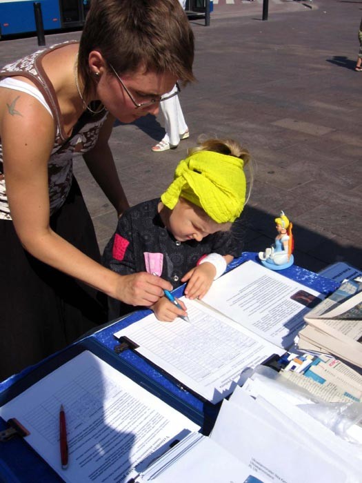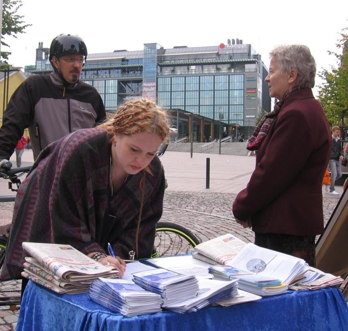 法轮功学员在芬兰赫尔辛基音乐艺术节期间举办讲真相活动图为民众签名声援法轮功2008-8-23