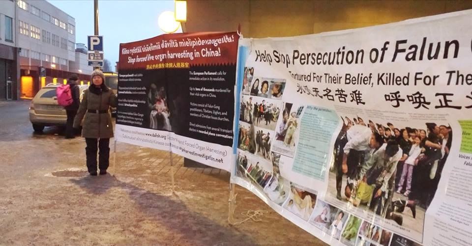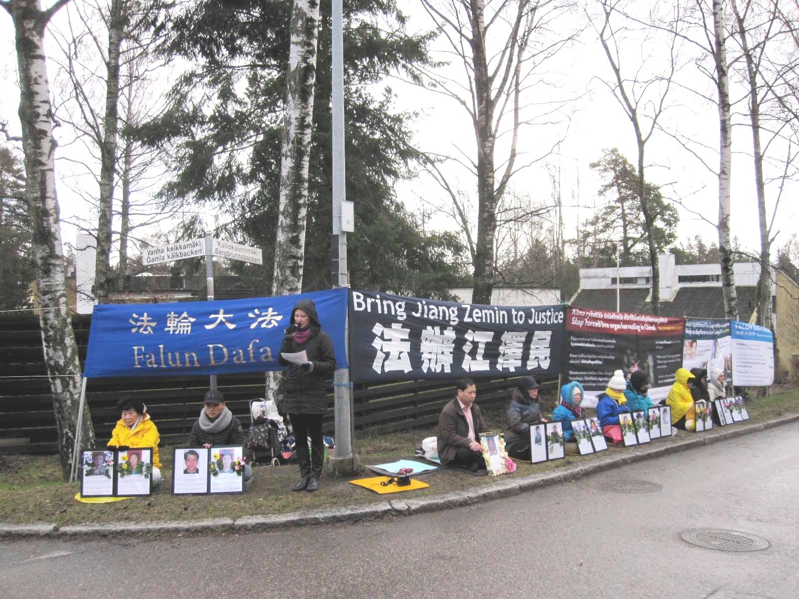 芬兰法轮功学员中使馆前和平请愿,抗议中共虐杀法轮功学员高蓉蓉,要求严惩凶手