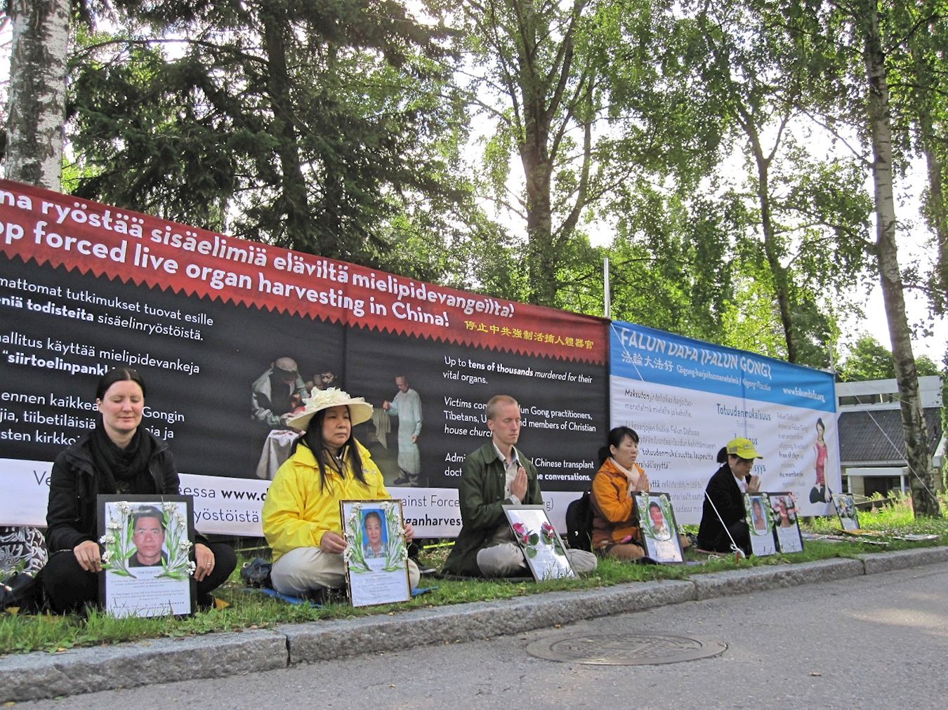 法轮功学员在驻芬兰中共使馆外的和平请愿,揭露中共的暴行