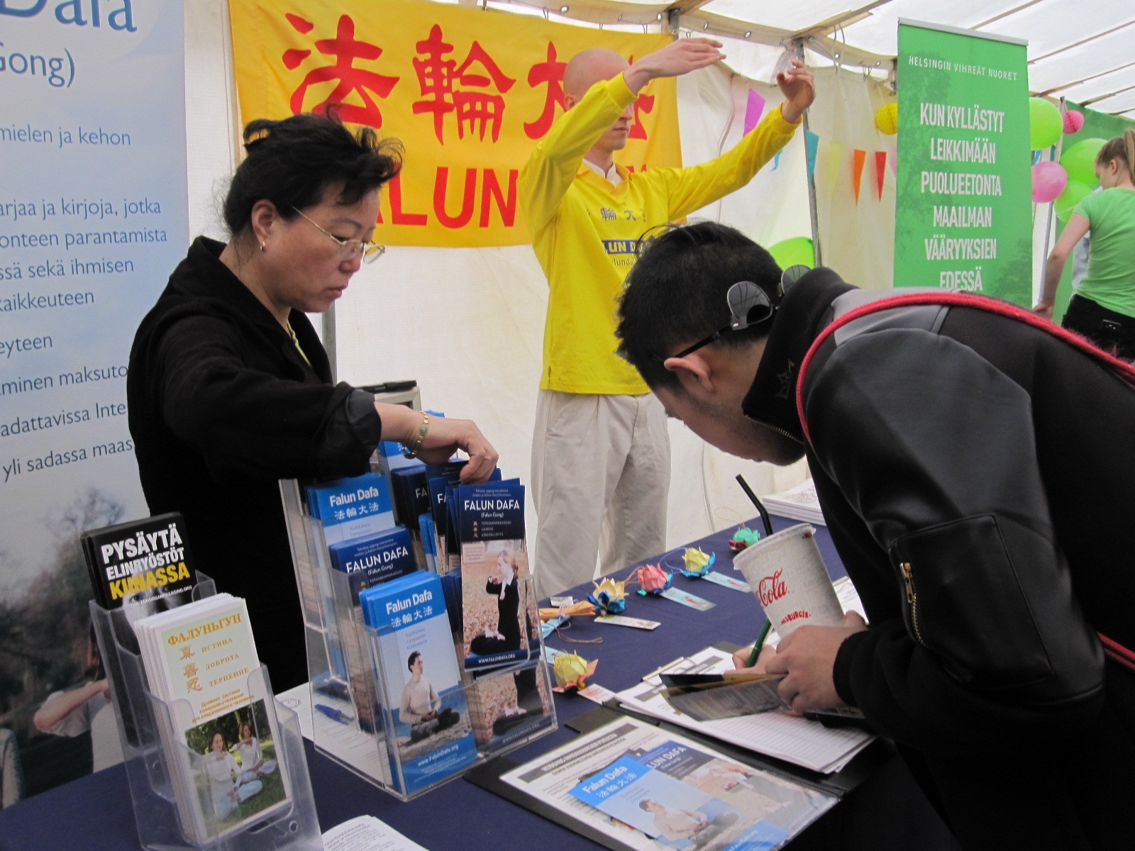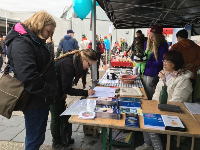 法轮功学员参加芬兰世界村活动,人们签名声援反迫害
