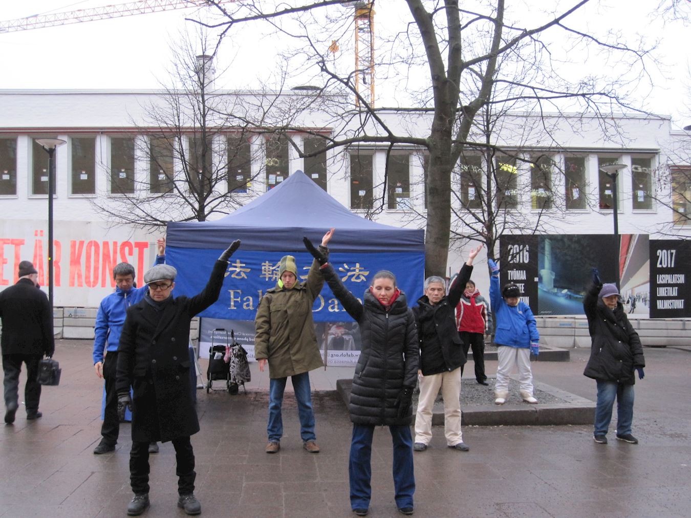 芬兰法轮功学员中使馆前和平请愿呼吁停止迫害法轮功 图为学员在炼功