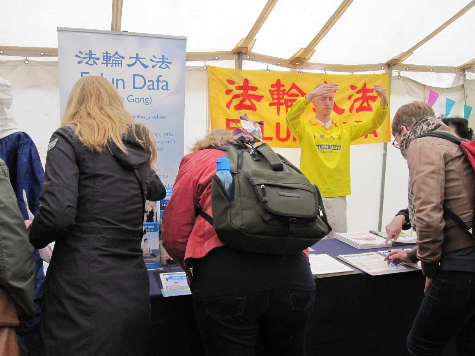 芬兰法轮功学员洪扬大法回顾,图为展销会上现场学功的民众