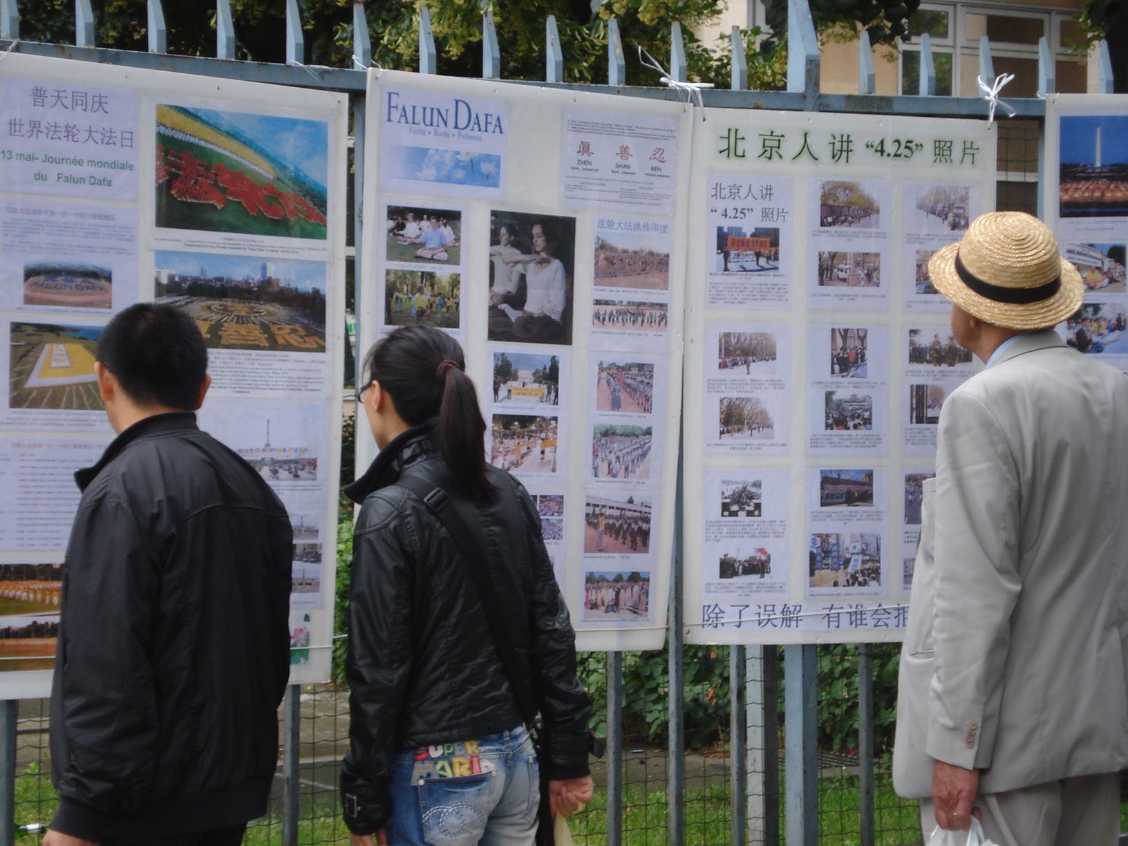 法轮功学员在巴黎人权广场上揭露中共的残酷迫害,观看真相展板的人们