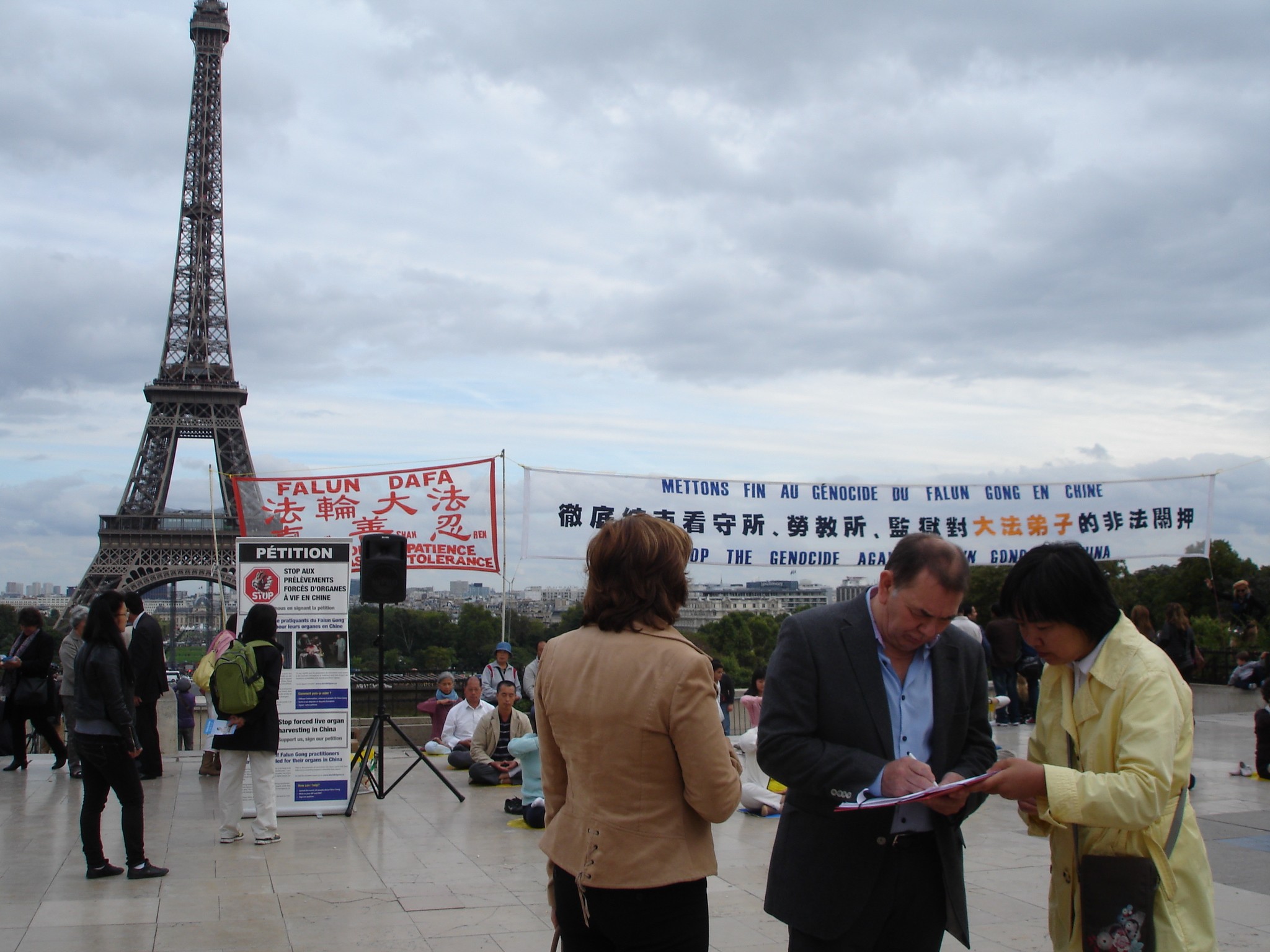 法轮功学员在法国埃菲尔铁塔对面的人权广场上广传真相图为民众签名支持法轮功2007-7-22
