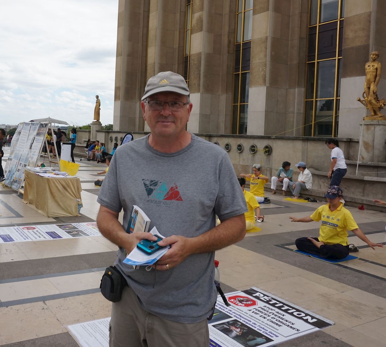 法轮功学员在巴黎的人权广场讲真相,安静、祥和的炼功吸引,不少游客驻足了解真相。