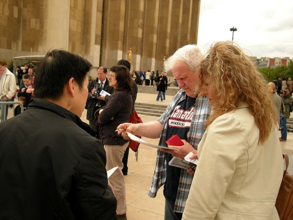 法国法轮功学员在埃菲尔塔前洪扬大法 人权广场上呼吁营救法轮功学员的遗孤 图为善良的人们表达他们的支持