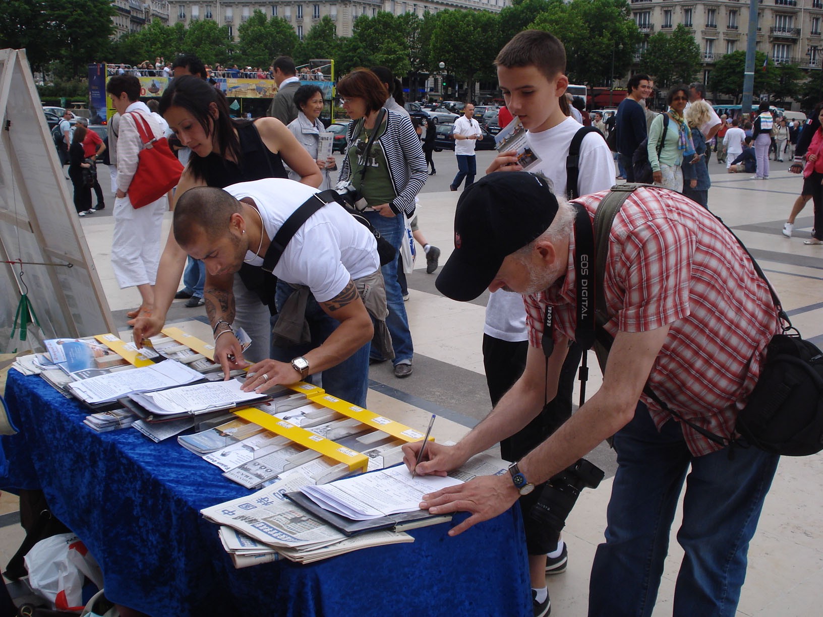 法国法轮功学员在巴黎马佑门广场洪法讲真相 图为游客纷纷签名表达对法轮功的支持
