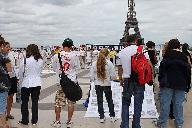 法国法轮功学员在巴黎艾菲尔铁塔前喜庆"世界法轮大法日"--被祥和优美的功法打动的游客