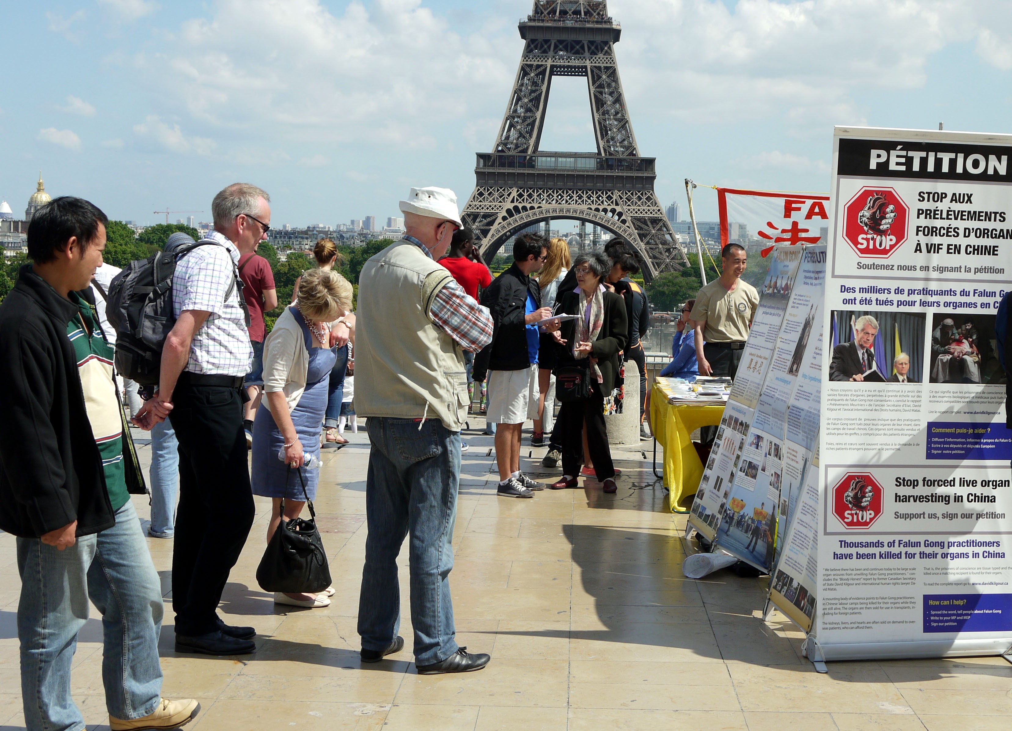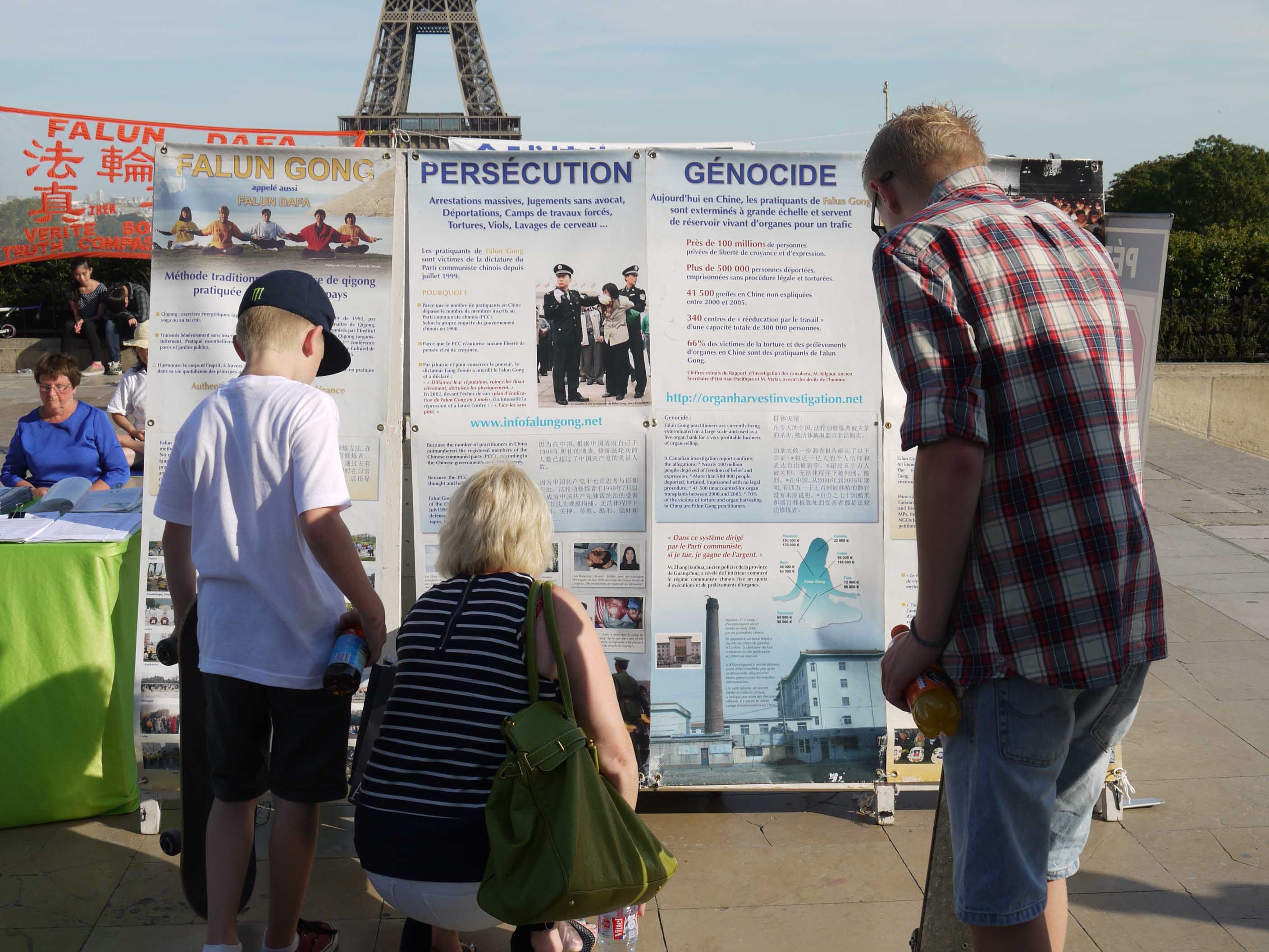 法轮功学员在巴黎人权广场揭露中共活摘器官罪行图为了解真相的民众