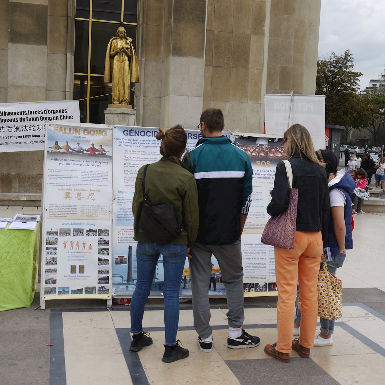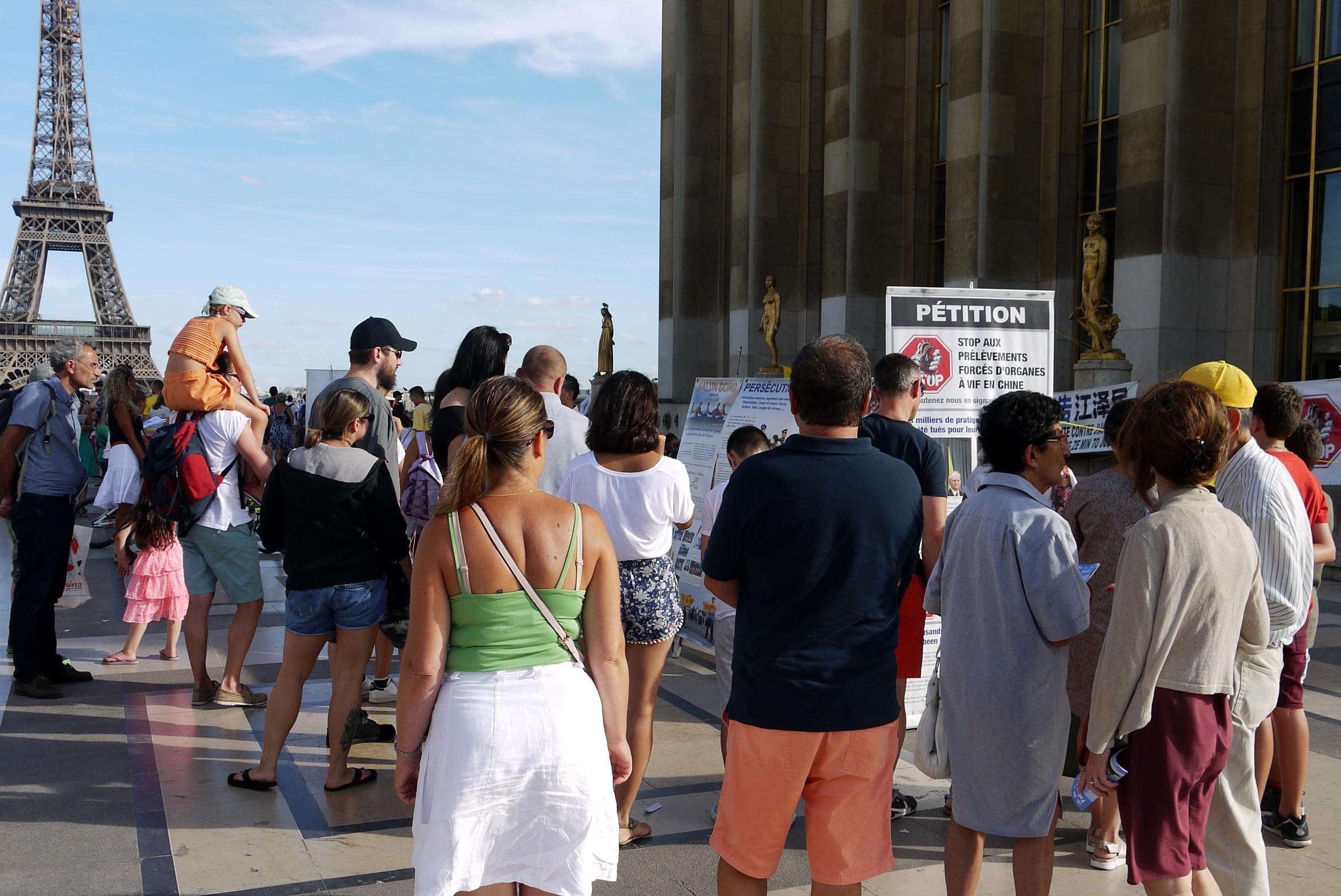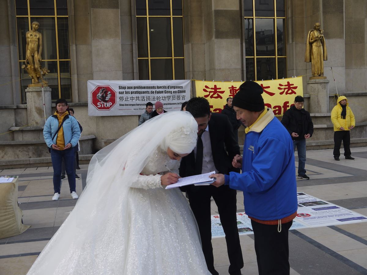 法轮功学员在巴黎人权广场举办讲真相活动,同时征集签名揭露中共活摘器官的罪行