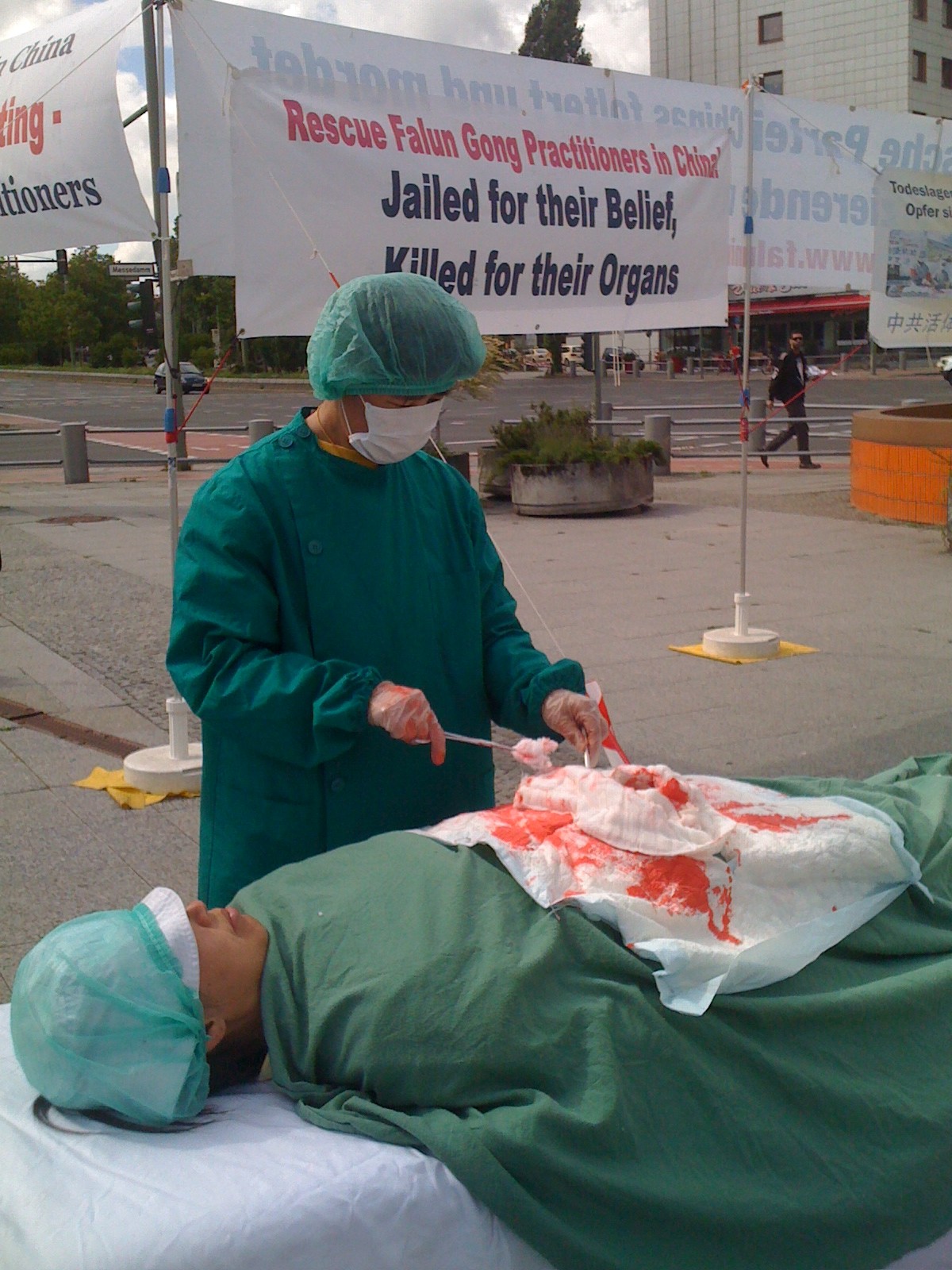在国际器官移植会议开会地点前,法轮功学员模拟演示中共活摘器官
