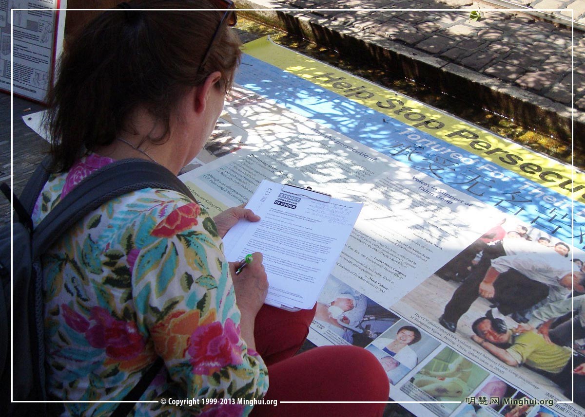 路人签名支持法轮功,呼吁国际社会调查中共活摘法轮功学员器官的罪行