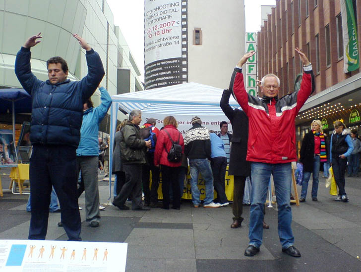 德国学员在步行街讲真相 呼吁民众谴责中共活摘法轮功学员器官的罪行 图为法轮功功法演示 2006-9-30