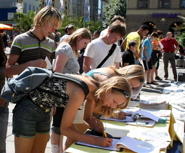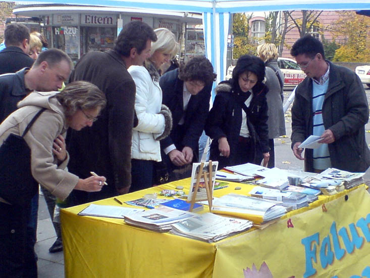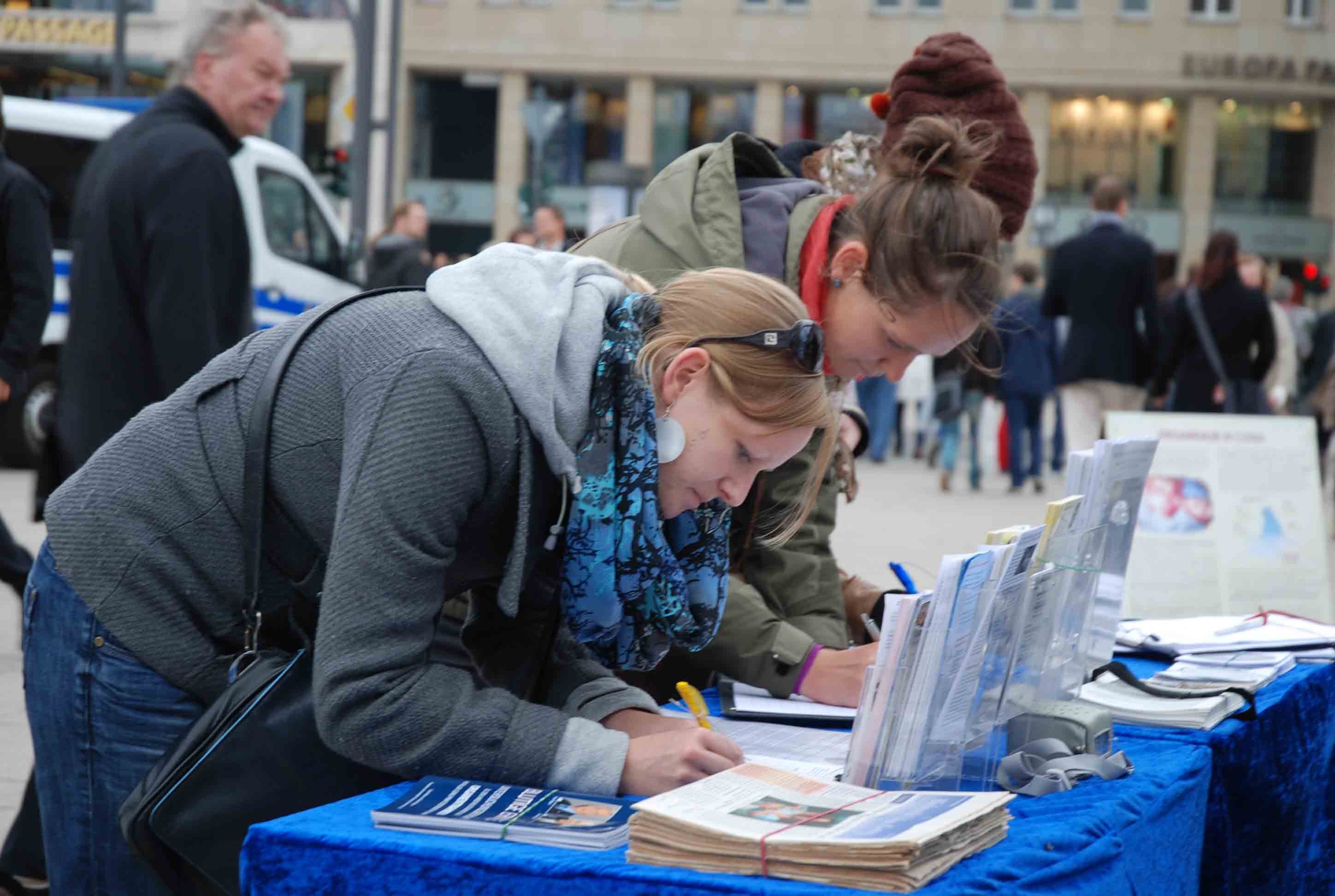 法轮功学员在德国北威举办反酷刑展,揭露中功十年的残酷迫害,民众在征签簿上签名