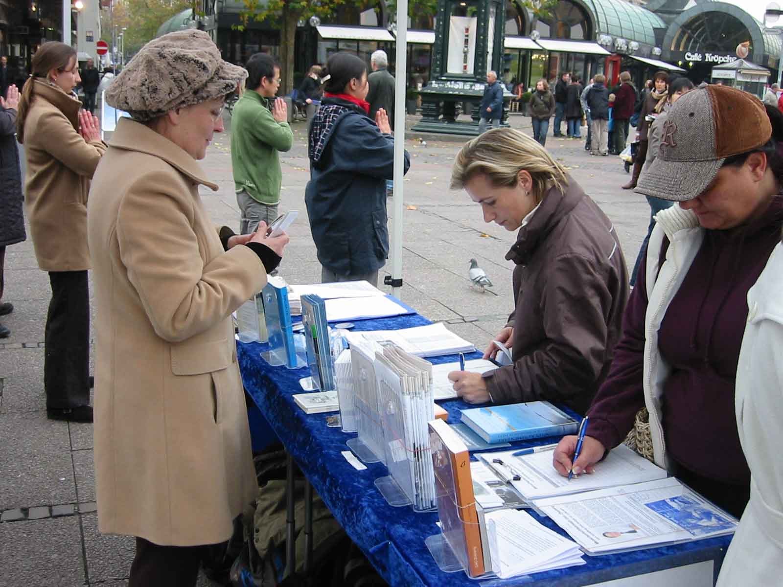 法轮功学员在德国汉堡步行街摆设展位讲真相图为人们纷纷签名支持反迫害2007-11-3